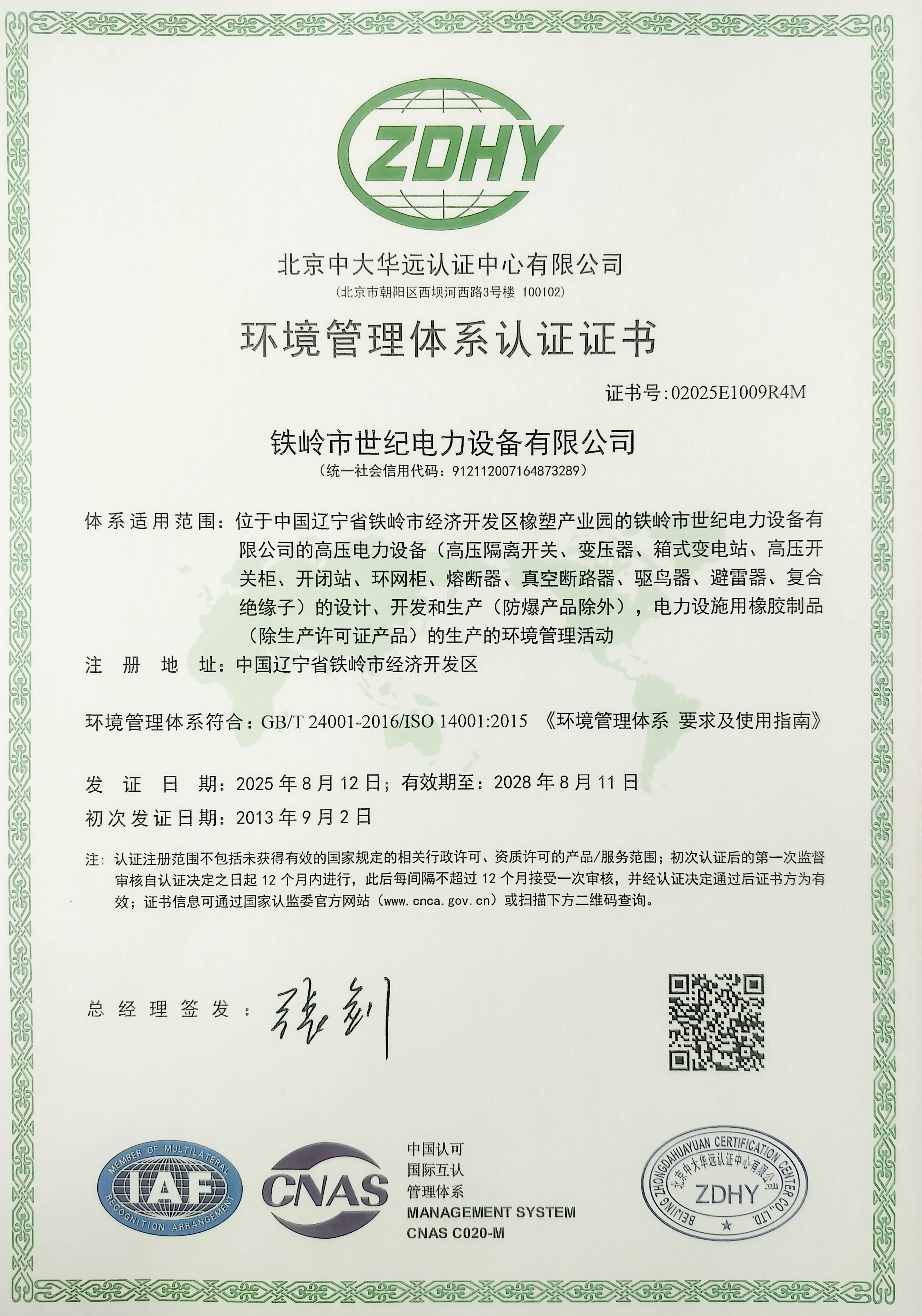 環(huán)境管理體系認證證書
